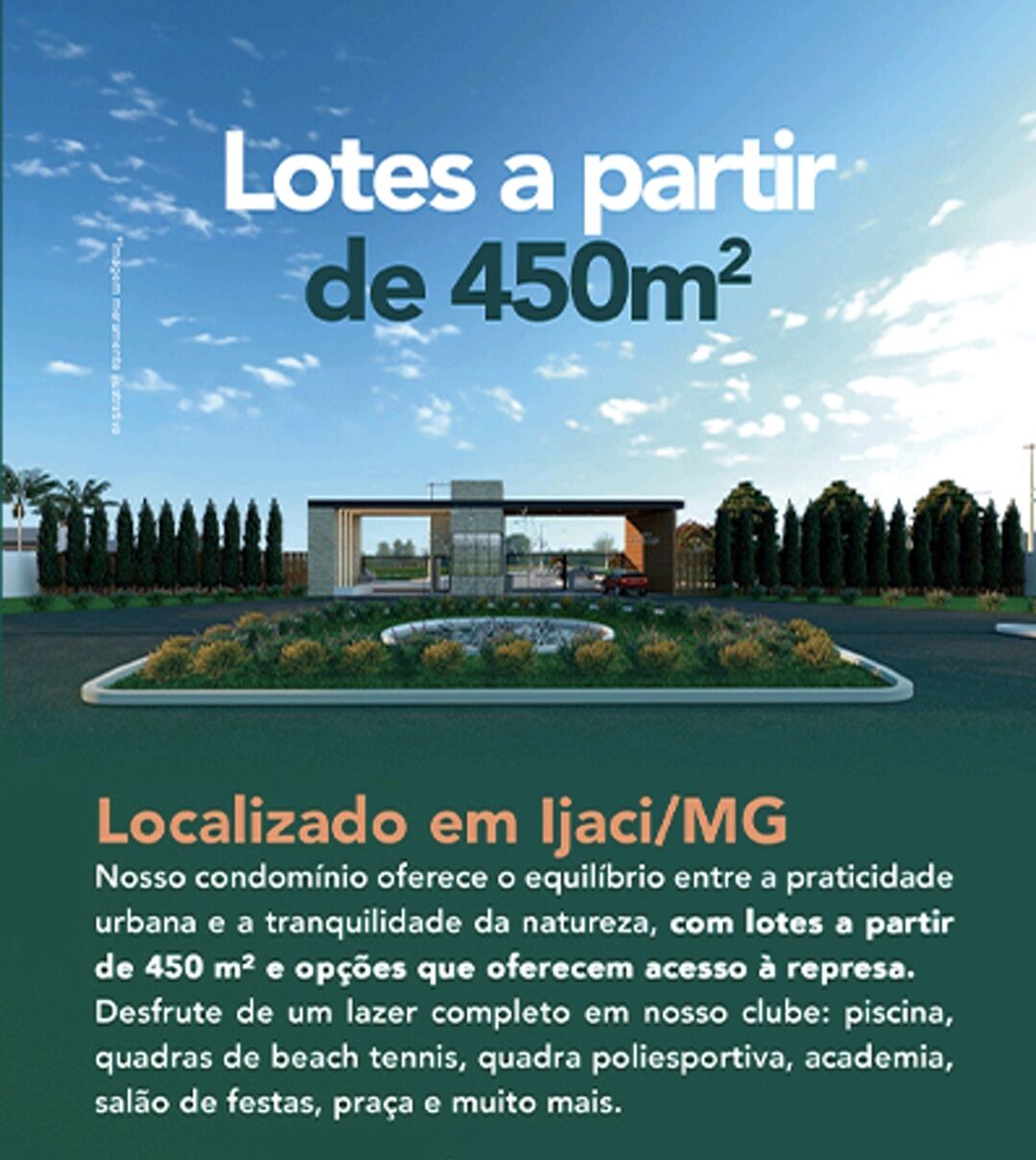 Acesso asfaltado e estrutura completa com: piscina, quadras de beach tennis, quadra poliesportiva, academia, salão de festas, praça e muito mais.